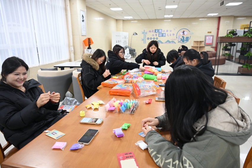 活动设置三大特色体验区,吸引师生踊跃参与。“粘土娃娃DIY”区,师生用超轻粘土捏塑灯笼、福字、元宝等吉祥物件,在创作中寄托新年美好期许;“漆扇制作”区,大家领取空白扇面,或书写祝福、或绘制心仪图案,经上漆处理呈现独特纹理色彩,成品收获一致好评;“书写祝福”与“时间胶囊”区人气高涨,活动特邀王忠民博士、邓新影副教授现场为师生送对联、赠福字,同学们或执笔写下新年愿望与规划,或将美好祝福封存,寄送给来年的自己。